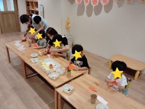 ①オレンジ色の折り紙をちぎって貼り付けよう。
