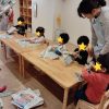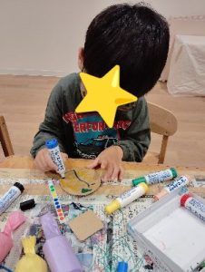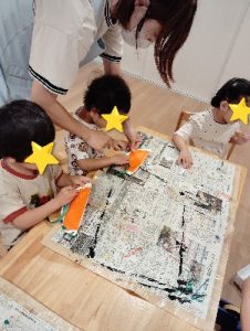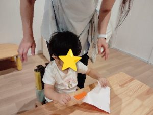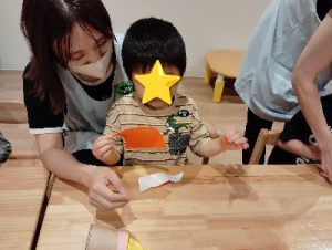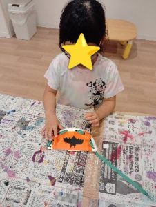 ①オレンジ色の折り紙をちぎって貼り付けよう。