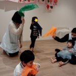 みんなで手を繋いで歌ったり、リズムに乗ってお手玉をおせんべいに見立てて焼いてみたり。
